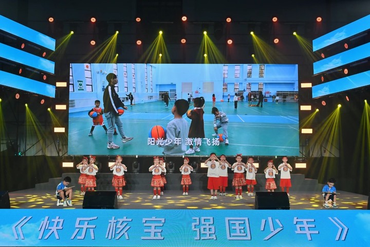 可爱的“核宝们”在台上展示了在“七彩阳核·宝托管班”上学到的技能,用动人手势舞表达了强国少年应有的姿态。
